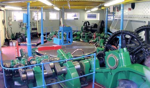 The swinging portion is a continuous girder over two spans, each of which gives a clear waterway of about 31.4m. It consists of two main iron girders of triangular construction with curved top boom and a straight bottom boom. When turning about 900 tons of the total weight of 1,300 tons of the swinging portion is supported by an hydraulic centre press which reduces the effects of friction and wear and tear on the forty-two 9,144mm diameter rollers which turn on a roller path of about 13.1m diameter. The bridge, when open to road traffic, is supported at the end by cast iron blocks moved and locked into position under the girders by hydraulic rams. The motive power for operating the bridge is supplied by hydraulic engines worked by electrically driven pumps to a pressure of about 49 kg cm2 and all machinery is duplicated as an insurance against breakdowns.