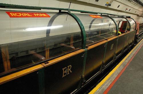 Each car had four containers, together carrying an average load of sixty bags of letter mail or twenty-four of parcels. As the train came to a standstill alongside the platform, a hinged metal ramp on the vehicle was let down to bridge the gap between car and platform. The loading and unloading of the vehicle was then by hand. A system of lifts and spiral chutes, in which mail matter for east and west-bound trains was seperated, connected the platform at each station with the sorting offices above. Slow-moving containers were also installed at some stations to carry mail up to, and from, the sorting offices and station platforms above.