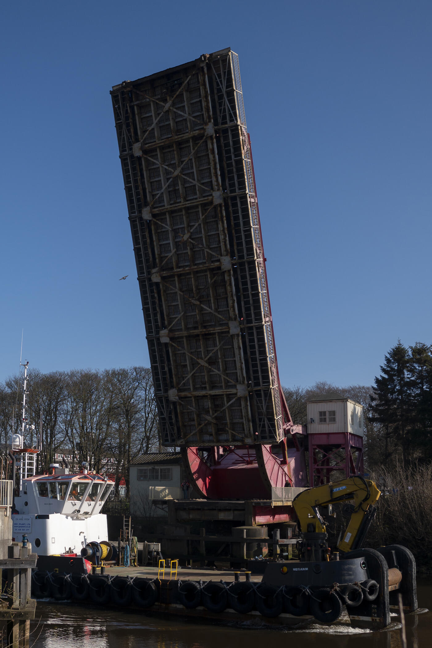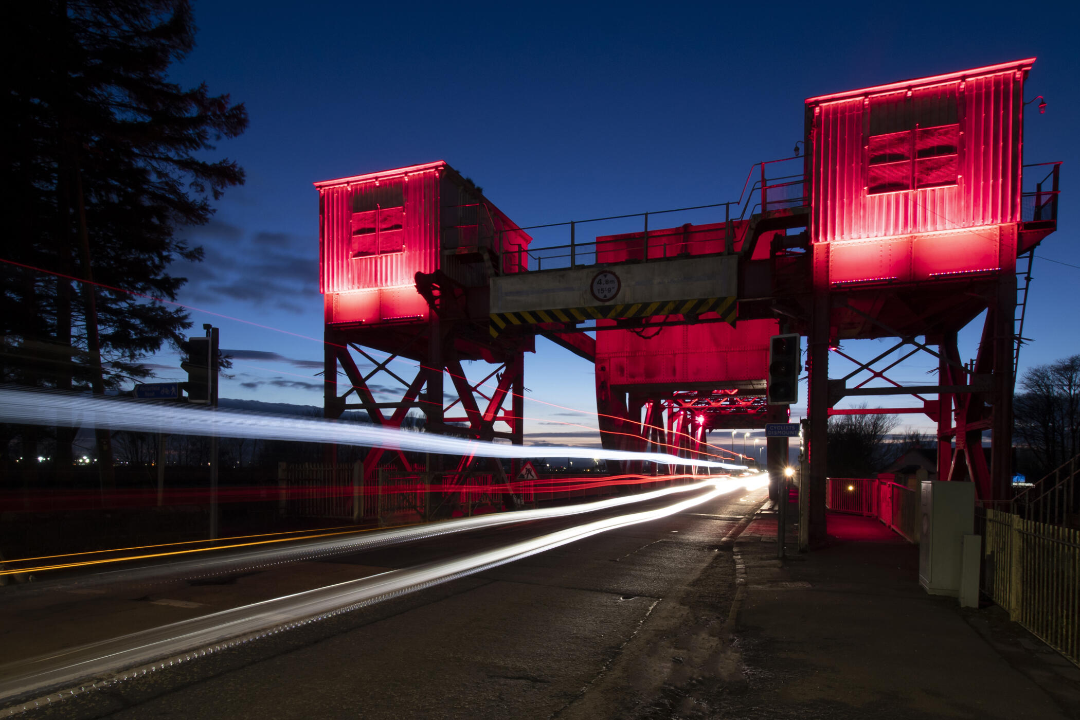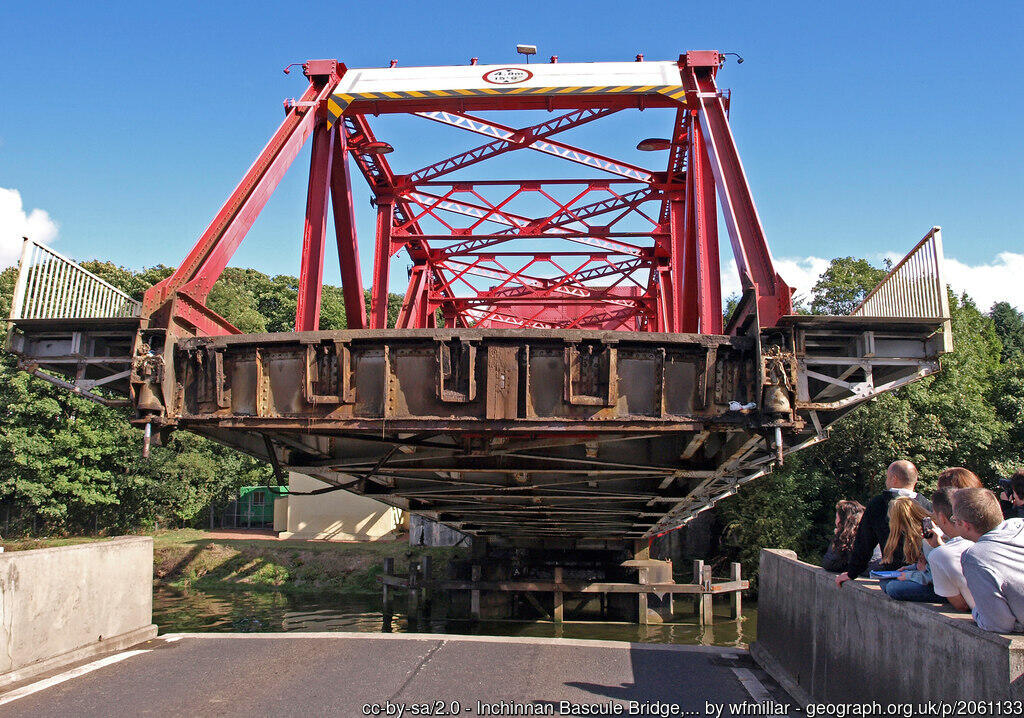 Designed by William B Hall and engineered by William Arrol Company Limited, this Grade A-listed structure received in August 2004 a £1M restoration project in connection with Historic Scotland. This involved strengthening, renewing all the mechanical components and resurfacing the road. The bridge was also painted red and cream and had new lights installed. The protective paint system of vibrant colours and the architectural lighting installation dramatically enhance this unusual structure whose control room is accessed by stairs with the engine-house having a counterbalancing weight. Having been much more frequently in action when Paisley Harbour was still active and Cart Shipbuilders was in business, it still has to swing occasionally for traffic to Westway Harbour, and performs each September for Doors Open Day, in 2023 to celebrate its centenary.