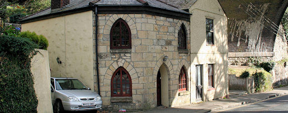 Its external features consist of two-storeys with a canted bay front, having a hipped, hip over bay, slate roof, with walls mainly of squared stone. It has Gothick arch headed windows with tracery, an open porch with a Gothick arch headed doorway. There is an ashlar stone front with space over the doorway for the tollboard.
