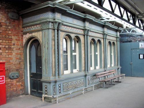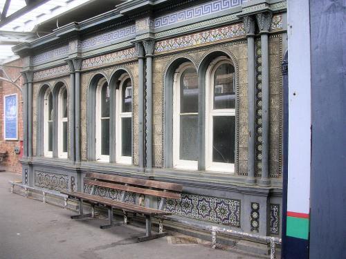 On platform 2b is the ladies' waiting room. It is a cast-iron structure cast at the Vulcan Iron Works at Worcester. This was a subsidiary of the MacKenzie and Holland signal manufacturing company about 200 yards from Worcester Shrub Hill station. The exterior is decorated with classical pilasters and covered with "majolica" ceramic tiles made by Maw and Company of Broseley. Maw was originally a Worcester company founded in 1850 when they bought the old Chamberlain tile factory. However in 1852 they moved to Broseley to be nearer their source of clay. In the main they made encaustic tiles rather than the "majolica" ceramic tiles used to decorate the Shrub Hill waiting room.