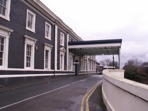 The present station building was designed by Edward Wilson and built in 1865. It is a Georgian-style building mainly of engineering brick with stone facings. Originally there was also a train shed which was removed in the 1930s.