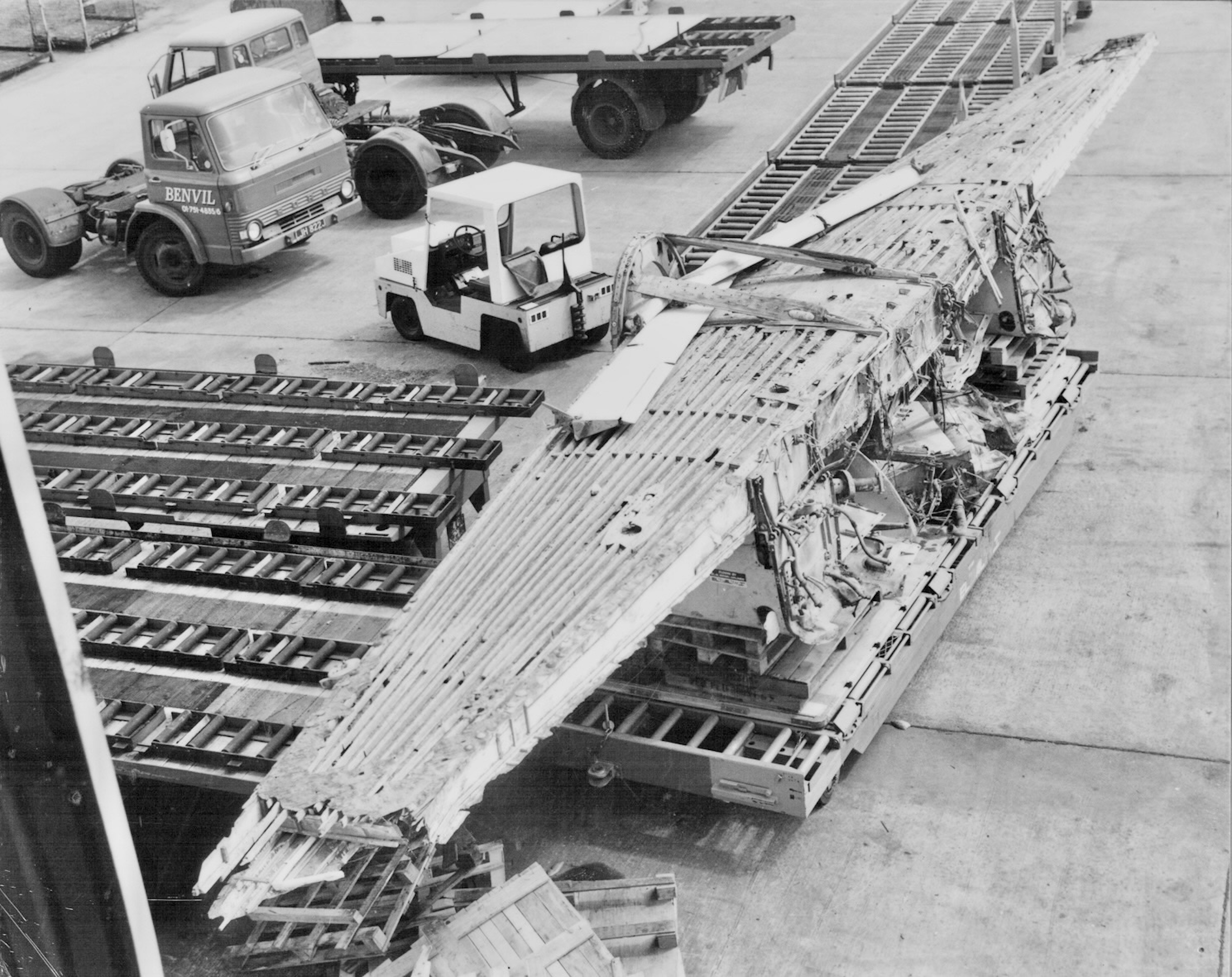 The early years of the rstoiration work were spent gathering components, and activity often sank into abeyance as other projects took priority. Our Mosquito, TA 122, a bomber and fighter/night fighter, was sold ex service in June 1950 to Delft Museum of Technology, for £15, minus engines, armament and instruments. The idea was to use it to instruct students on airframe technology. To make it fit in its new home, the wing was sawn off either side of the fuselage. By 1965 TA122 had been moved to the store of a military museum, still in Holland.